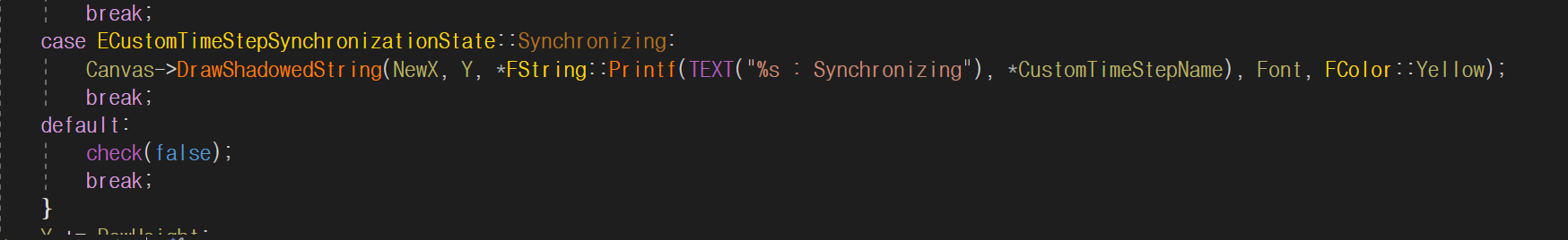 Canvas->DrawShadowedString(NewX, Y, *FString::Printf(TEXT("%s : Synchronizing"), *CustomTimeStepName), Font, FColor::Yellow);