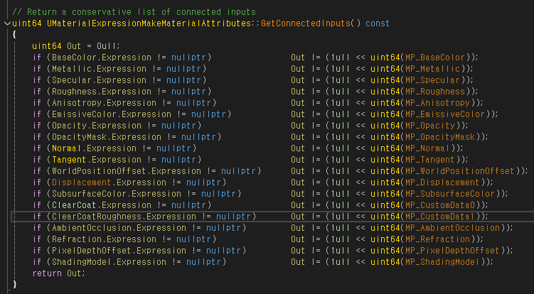 SetMatAttributeConditionally(EMaterialProperty::MP_CustomData1, MakeMatAttributes->ClearCoatRoughness.IsConnected());